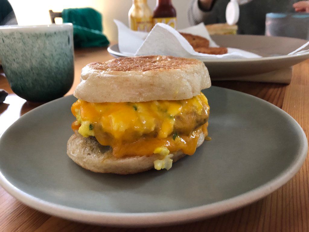 : Creamy chive scrambled eggs, sausage, and melty cheddar on toasted English muffin